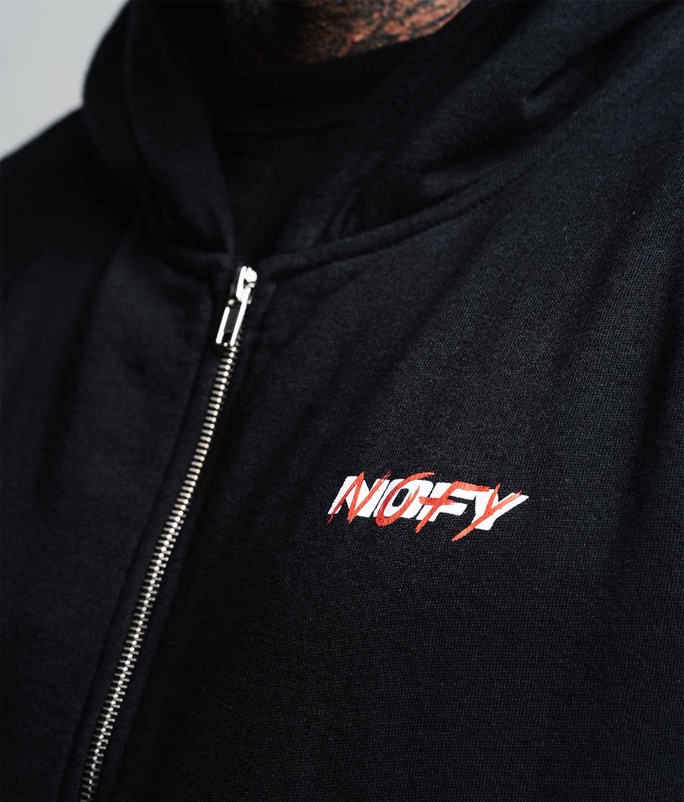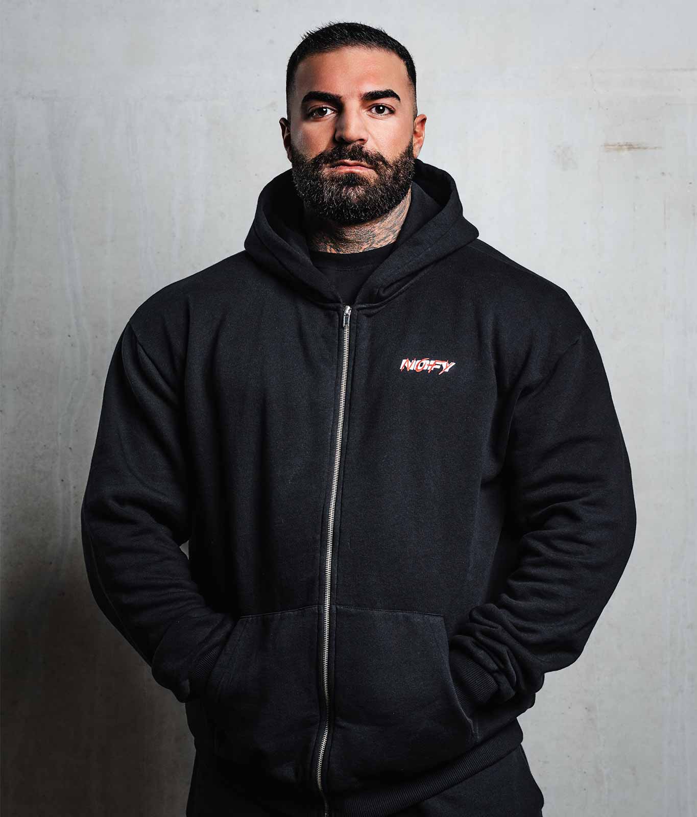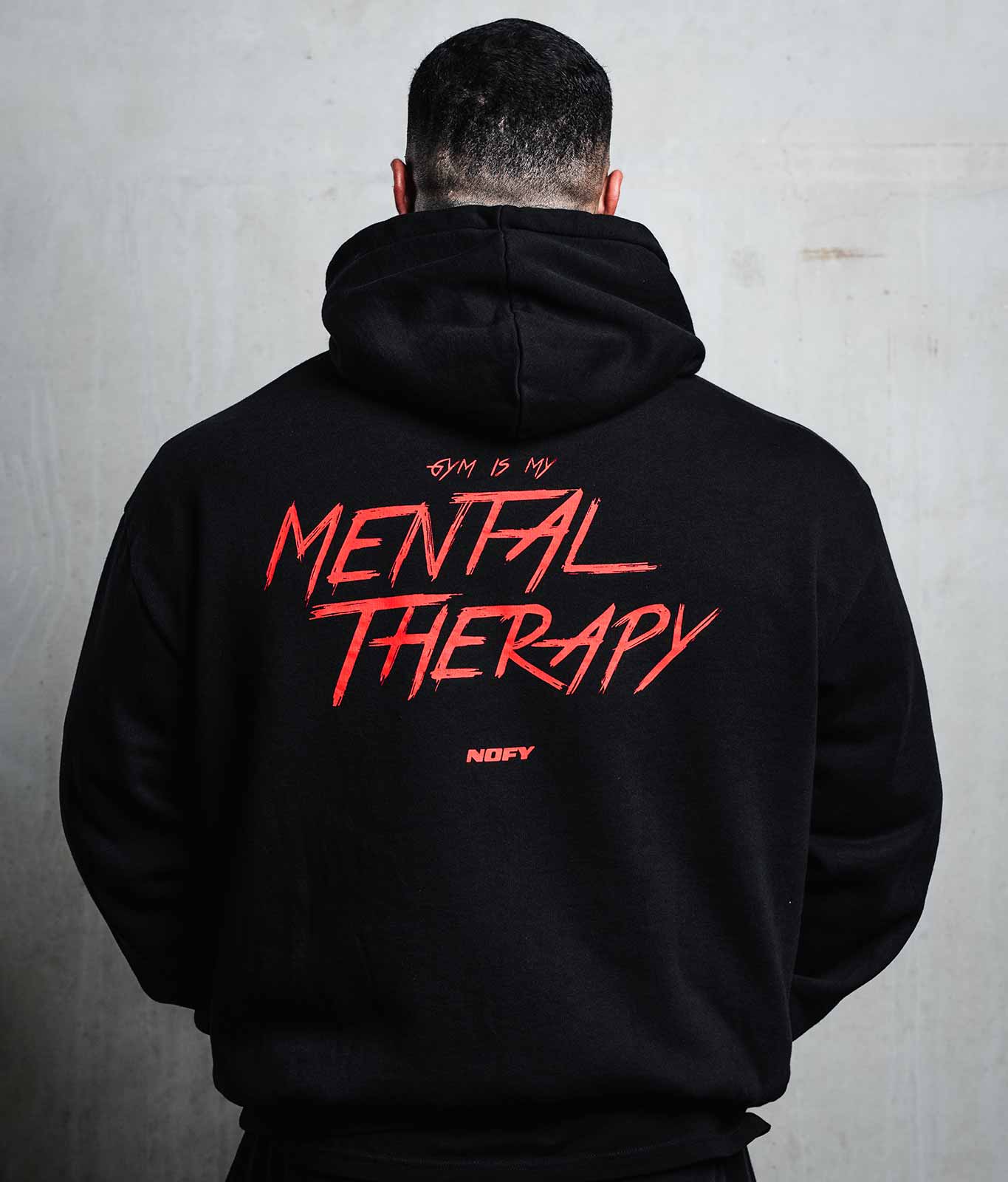 Oversize Zip Hoodie in Schwarz. Klare Message als Backprint: Gym is my Mental Therapy. NOFY Frontprint im Look der Winter Arc Kollektion.